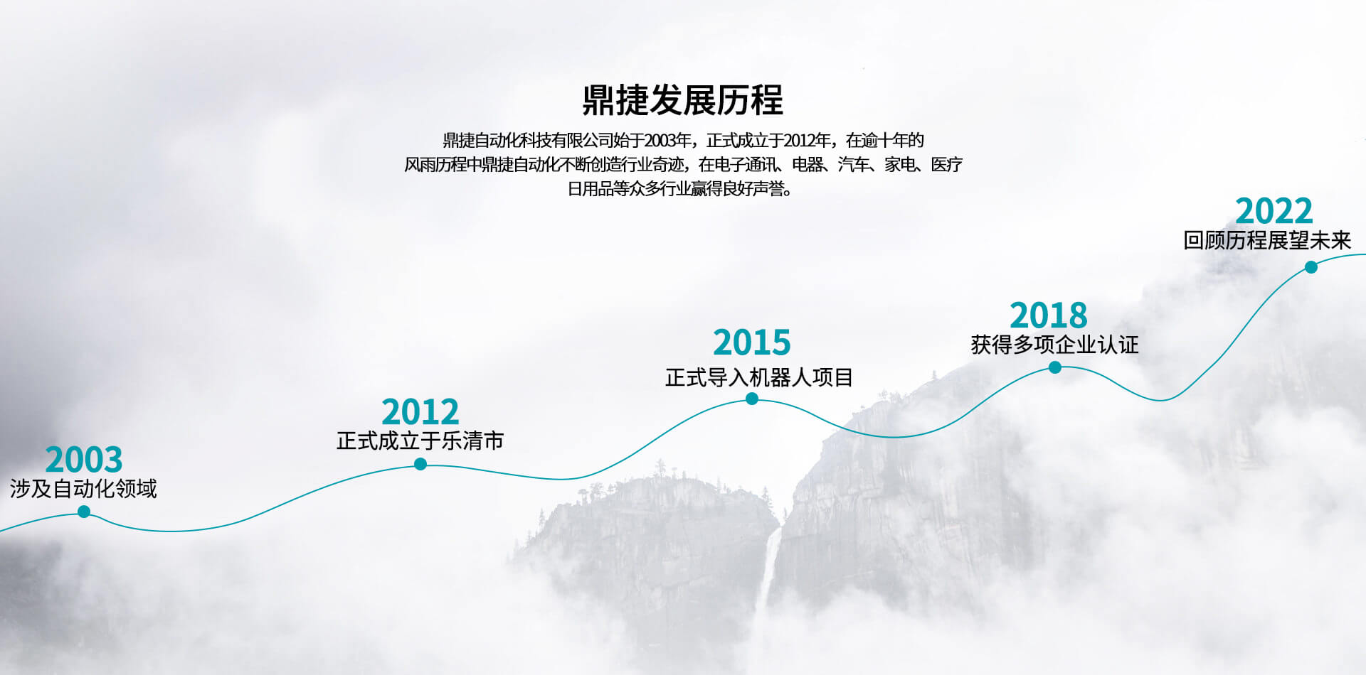 公司始于2012年,在逾十年的風(fēng)雨歷程中,不斷創(chuàng)造行業(yè)奇跡,在電子通訊、電器、汽車、家電、醫(yī)療、日用品等眾多行業(yè)贏得良好聲譽(yù)。公司坐落于浙江省樂清經(jīng)濟(jì)開發(fā)區(qū),現(xiàn)有人員63人,擁有經(jīng)驗豐富的工程技術(shù)研發(fā)團(tuán)隊11人,其中高級工程6人,具備本科以上學(xué)歷高級工程人員比例78%;同時鼎捷自動化在蘇州,東莞等地設(shè)立分公司以服務(wù)目標(biāo)市場客戶,目前鼎捷自動化已經(jīng)為下客戶提供配套自動化解決方案:泰科、安費諾、莫士、華為、中興、普聯(lián)、智英、意華、德豐、公牛、萬事達(dá)、華豐、飛雕、普思、冠聯(lián)、俊朗松田、進(jìn)聯(lián)、高正、盛凌等。鼎捷自動化專業(yè)從事連接器、開關(guān)及相關(guān)電子、電器、五金、塑膠產(chǎn)品組裝自動化定制、設(shè)計、制造、銷售。2012年,鼎捷自動化正式導(dǎo)入機(jī)器人應(yīng)用項目,可為各類客戶提供電子、電器、汽車、五金、塑膠等集成自動化智能組裝系統(tǒng)。